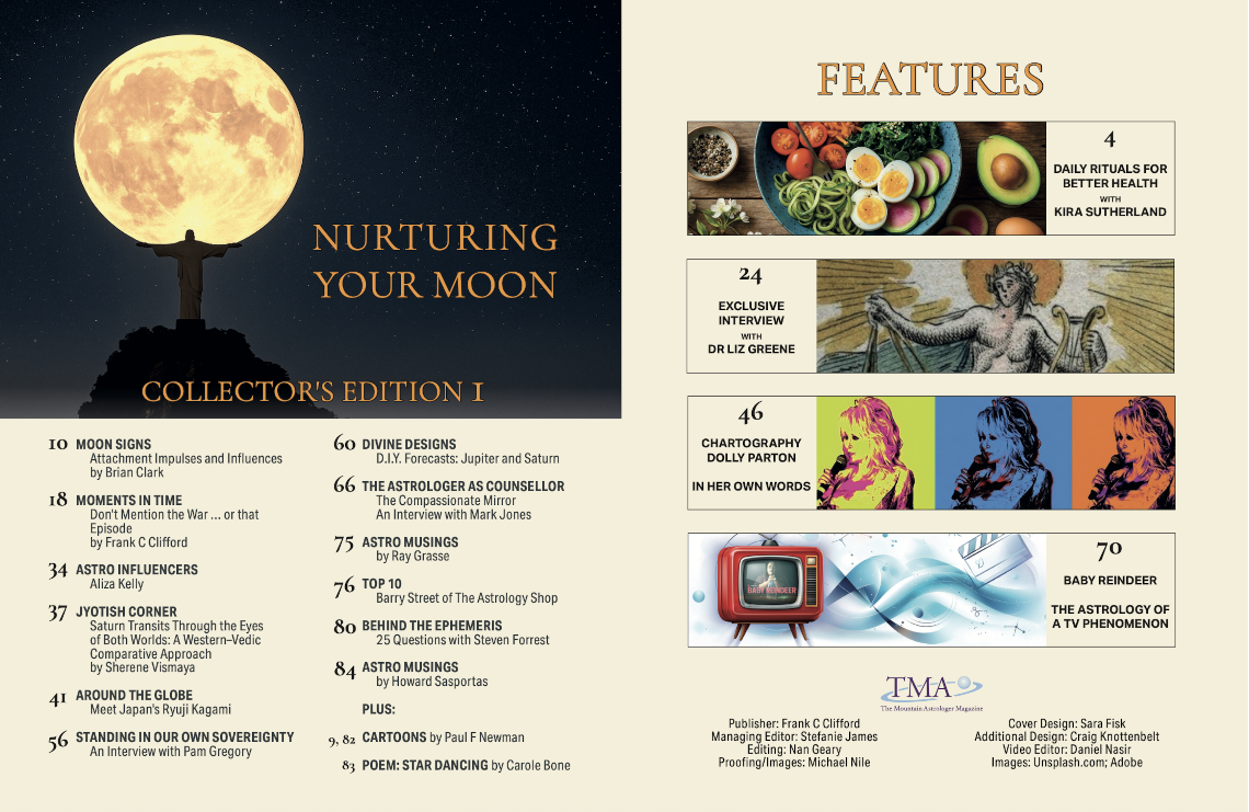 Articles include Moon Signs (Brian Clark), the Astrology of Baby Reindeer (Frank Clifford), Dolly Parton: In Her Own Words, an Exclusive Interview with Liz Greene, Daily Rituals for Better Health (Kira Sutherland), Divine Designs: Forecasting with Jupiter and Saturn, Saturn Transits: A Western–Vedic Approach (Sherene Vismaya), Astro Musings from Ray Grasse and Howard Sasportas, plus interviews with Pam Gregory, Steven Forrest, Mark Jones, Barry Street, Ryuji Kagami and Aliza Kelly.